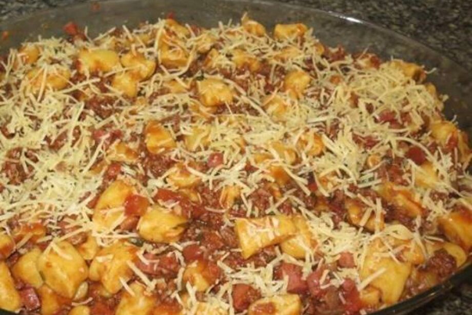 Colocar 2 litros de água em uma panela para ferver e colocar aos poucos o nhoque até eles subirem, onde são retirados com uma escumadeira e postos numa travessa refratária para depois ir ao forno com molho e queijo parmesão até gratinar