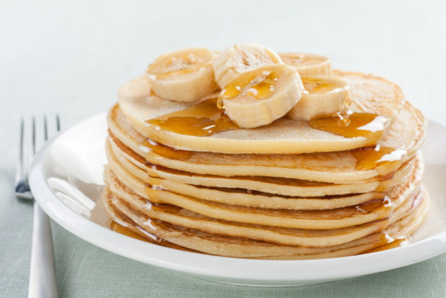 Finalize com rodelas de banana e mel por cima das panquecas.