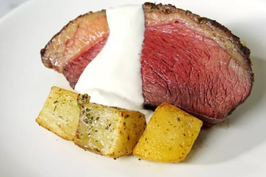 Fatiar a picanha e servir com as batatinhas e com o molho de mostarda.