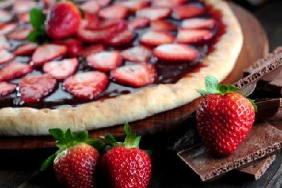 Retire a pizza do forno e decore a pizza com fruta de sua preferência.