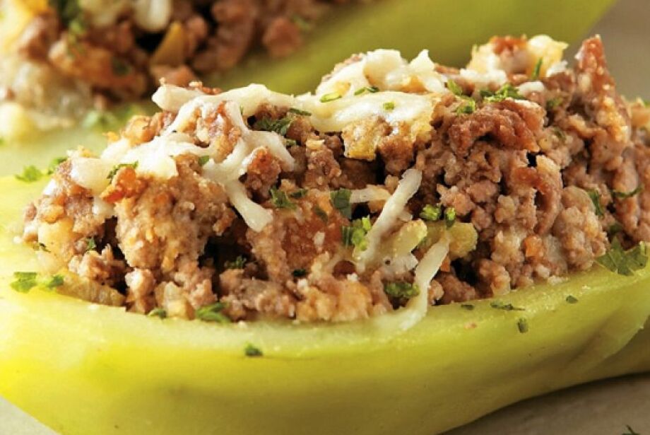 Nesse buraco que ficou dentro dos chuchus coloque uma colher de cheia do molho de carne moída, prenda as 2 partes com um palito de dente e arrume em uma panela funda