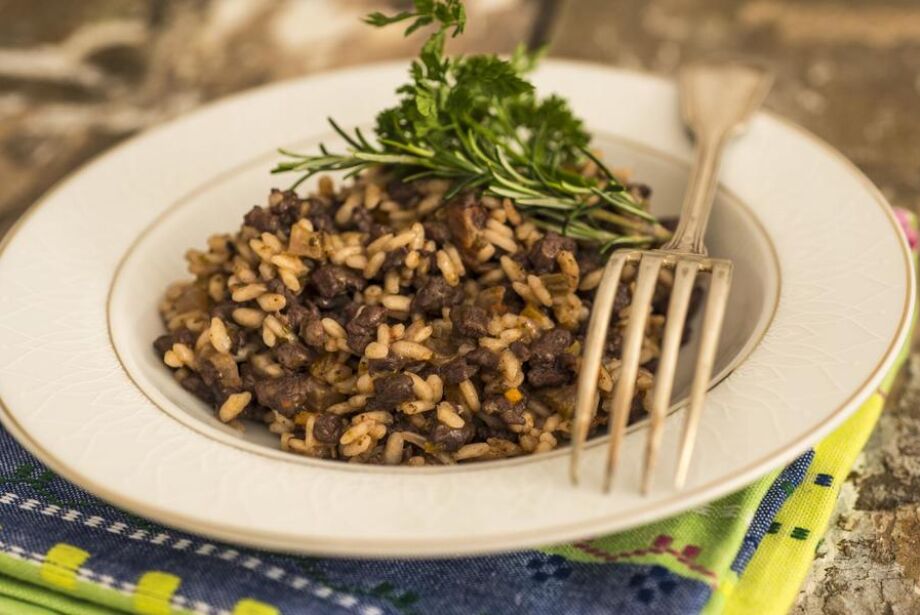 6) Quando o vinho tiver secado, comece a juntar o caldo quente aos poucos, à medida que o arroz for secando, e deixe cozinhar.