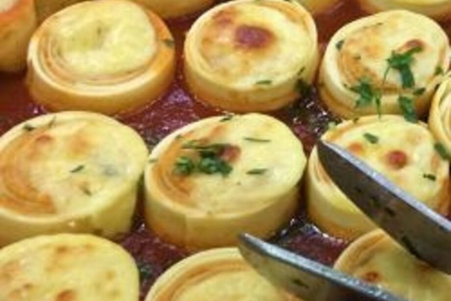 Arrume os rondellis em uma assadeira e jogue o molho de tomate por cima. Polvilhe com o queijo ralado e asse por 20 minutos. Retire do forno, polvilhe com a cebolinha e sirva quente.