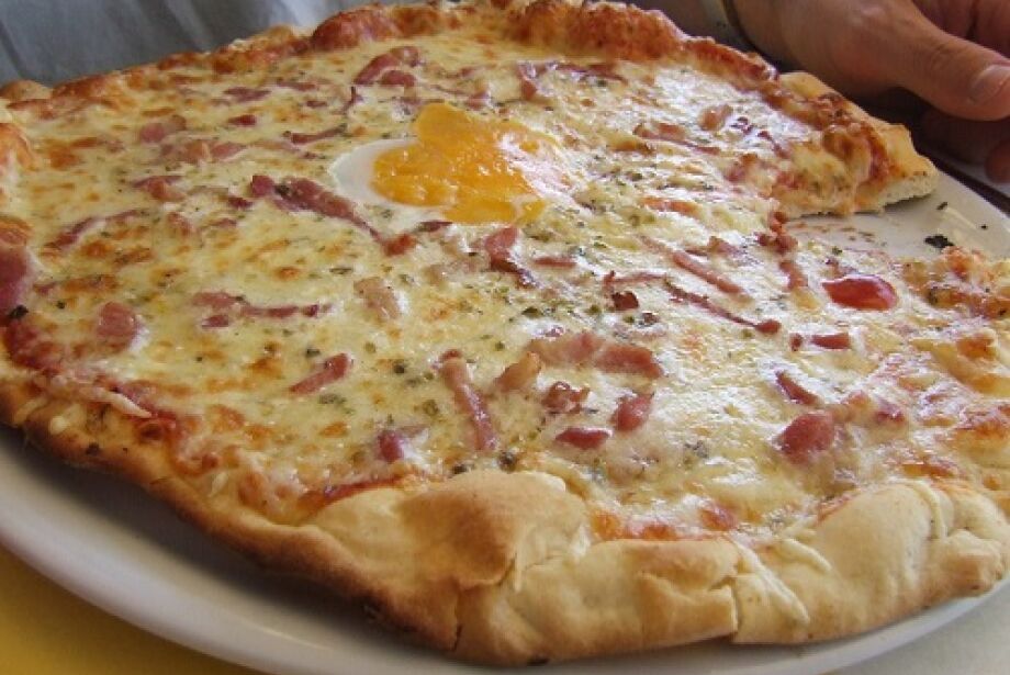 Dispor o queijo muçarela sobre a massa pré assada, a mistura de ovos e creme de leite, os cubos de bacon e o queijo parmesão.