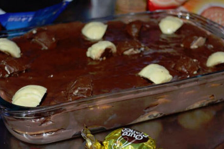Depois o creme, e por cima um pouco de chocolate picado, e novamente bolacha, creme e chocolate picado, e assim sucessivamente até que chegue a borda da travessa ou acabe o creme, sendo que a ultima camada vai ser de creme