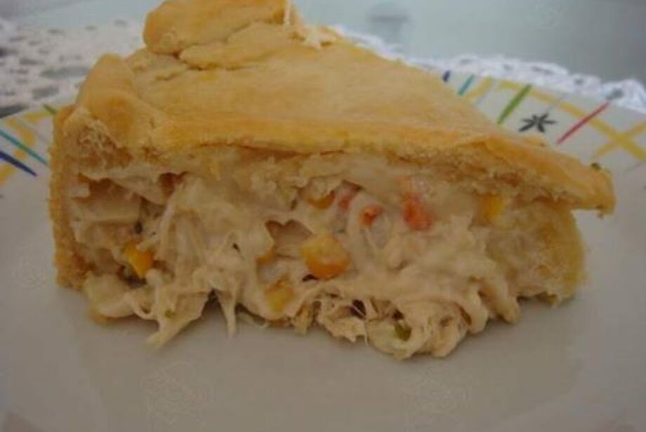 Faça a massa batendo os 7 primeiros ingredientes no liquidificador, unte uma assadeira, coloque uma parte da massa, o frango refogado, a mussarela, depois a outra parte da massa
