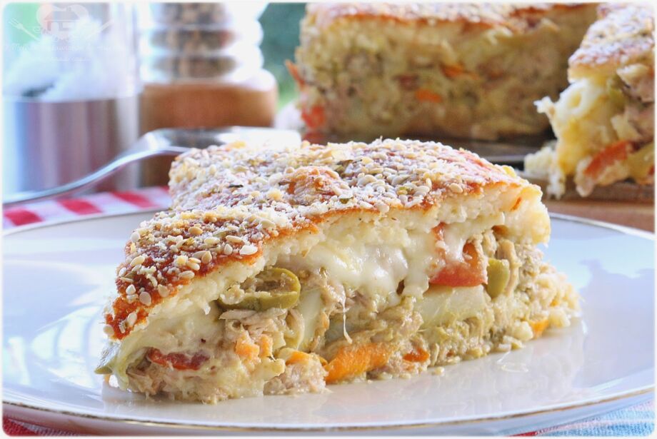 Unte uma forma retangular ou redonda pequena com margarina e trigo (usei uma forma redonda de 20cm de diâmetro de aro removível e cobri o fundo com papel manteiga), e coloque metade da massa de arroz. Espalhe o recheio (coloquei por cima do recheio fatias de queijo muçarela fatiado) e cubra com o restante da massa (por cima da massa salpique um pouco de gergelim, de queijo ralado e orégano). Leve ao forno médio-alto (200°C), preaquecido, por cerca de 35 minutos, ou até que fique dourado. Sirva a seguir.