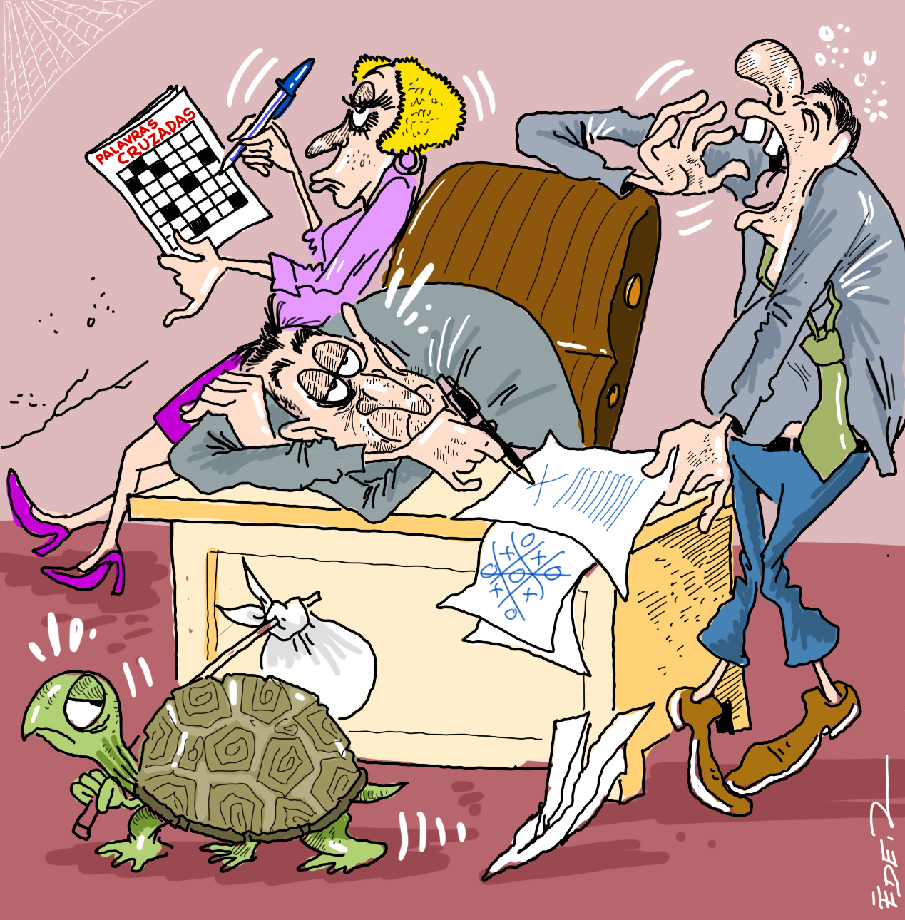 Em órgão público federal que teria dirigente apenas ocupando cargo decorativo graças ao QI (quem indica), o trabalho é tão lento que, segundo dizem, se colocarem uma tartaruga na sala, o animalzinho escapa. Muita gente está “chiando” que só com a paradeira geral na tal repartição, onde “suar a camisa” para agilizar os trabalhos continua sendo frase desconhecida. A continuar assim, os 18 meses que faltam para acabar o ano vão passar e é capaz de o dito-cujo achar que é “golpe dos inimigos da democracia”, que “suprimiram dias do calendário” para prejudicar a sua “estafante soneca” de cada dia. E assim caminha a humanidade...