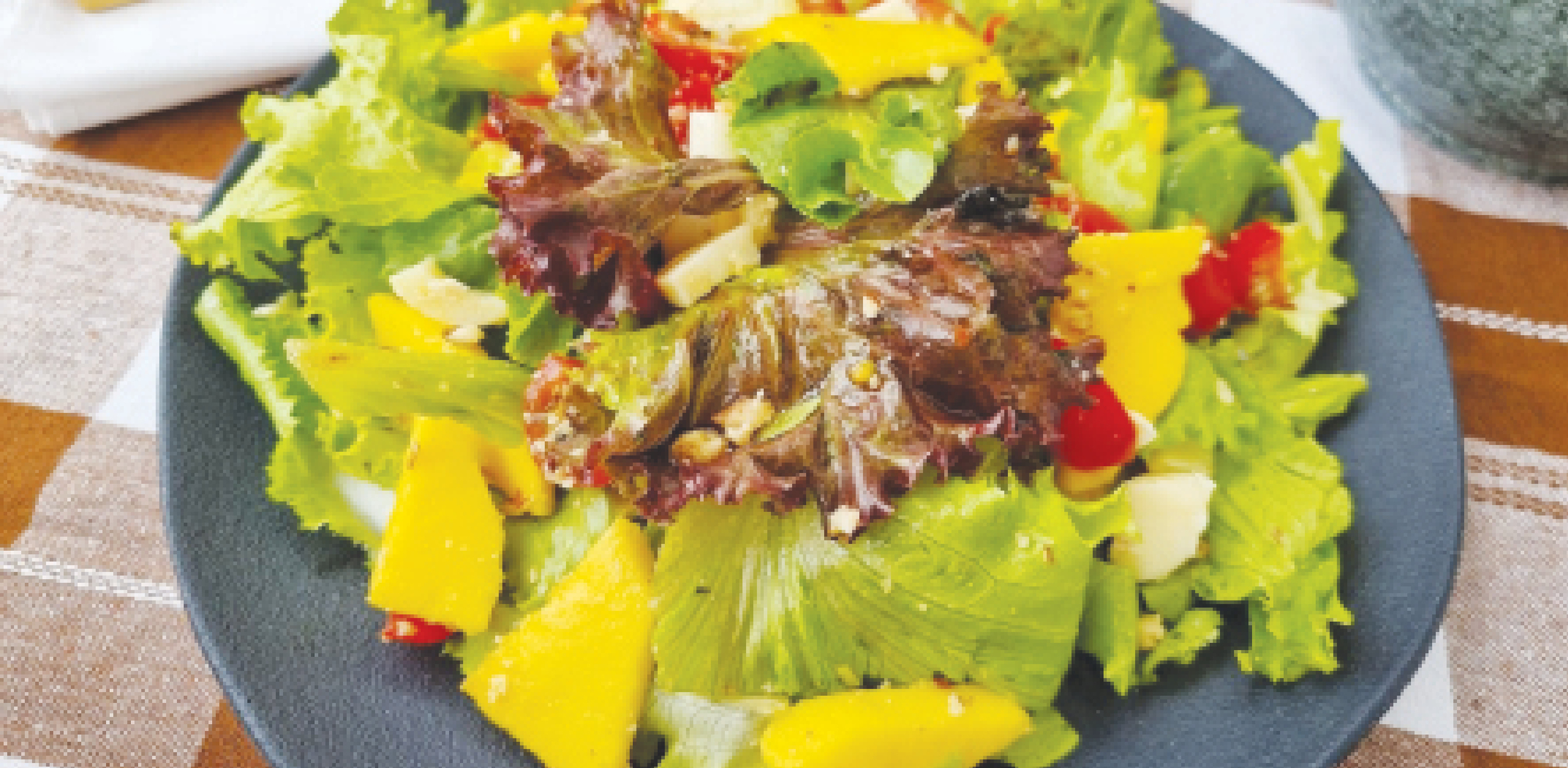 Em uma tigela, coloque as folhas rasgadas, o tomate, o palmito, a manga e as castanhas. Misture;