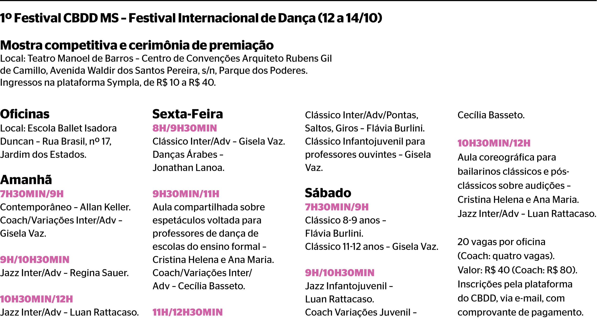 A programação do festival também prevê, durante os três dias, uma série de oficinas de formação (mais informações no box), vivências, troca de experiências sobre as várias modalidades e muita informação. A coordenação-geral local do 1º Festival CBDD MS está a cargo da professora Neide Garrido, que é delegada do Conselho Brasileiro da Dança em Mato Grosso do Sul.