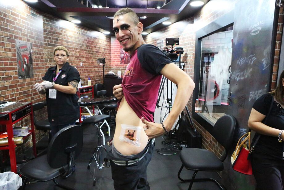 Na Comic Con Experience 2017 realmente tem de tudo, inclusive tatuagem de graça nas partes traseiras. Pois foi lá mesmo, em sua nádega esquerda, que o estudante de história Augusto Marques resolveu fazer a sua primeira tattoo: uma homenagem ao super-herói Deadpool que ele ganhou em uma promoção na feira de cultura pop.