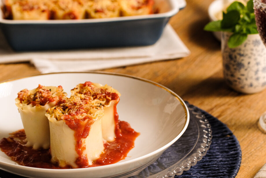 5- Enrole e coloque no refratário, depois cubra com molho e finalize com queijo parmesão.