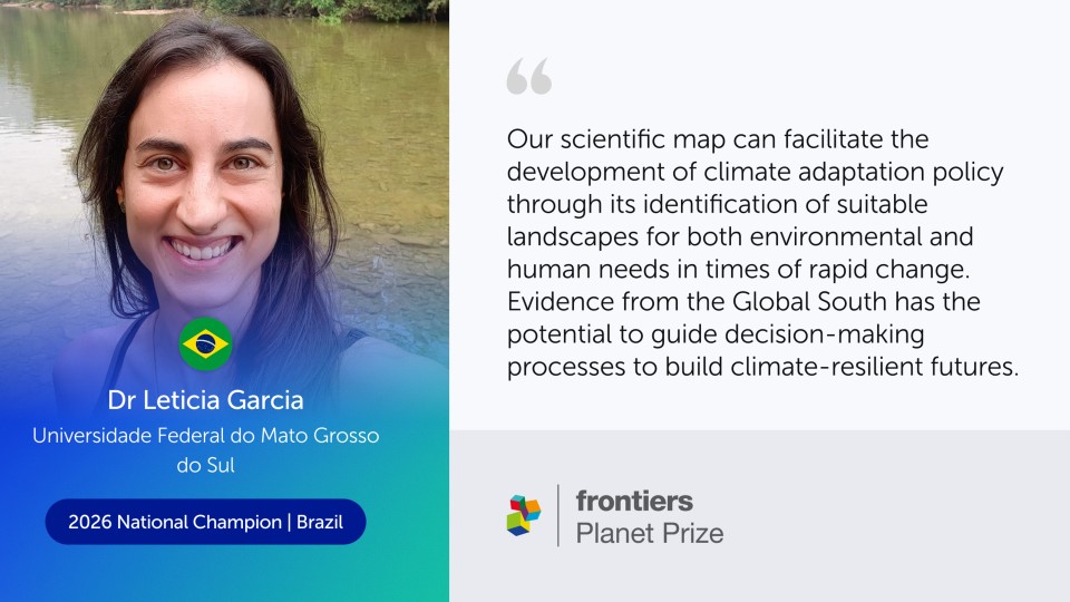 A professora Letícia Garcia, da Universidade Federal de Mato Grosso do Sul, é Campeã Nacional do Brasil para 2026 e finalista do Prêmio Frontiers Planet. A pesquisa da professora e sua equipe mapeia paisagens resilientes ao clima em todo o Brasil, identificando áreas onde a biodiversidade é mais robusta às mudanças climáticas. O artigo de pesquisa que garantiu à professora da UFMS o prêmio de Campeã Nacional é “Mapeando Paisagens Resilientes às Mudanças Climáticas em um País Megadiverso”, publicado na revista Global Change Biology. A indicação da professora Leticia foi feita pela UFMS e é a primeira vez da história da Universidade e de MS. A premiação é de US$ 1 milhão a três cientistas por ano. A cerimônia de entrega do Prêmio Frontiers Planet será realizada dia 18 de janeiro de 2027, em Davos, na Suiça.