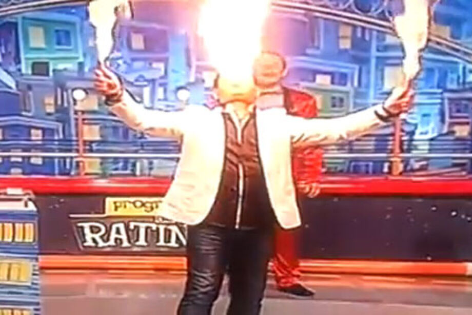 Ele ainda fez uma advertência ao público sobre o perigo da performance, antes de iniciar a pirofagia: “Não é para fazer em casa”. Luís Ricardo não conseguiu apagar o fogo e saiu correndo do palco. Ratinho foi atrás, mas depois tentou tranquilizar os espectadores: “Tá tudo bem. Deu uma sapecadinha no bigode. Levou só um susto”.