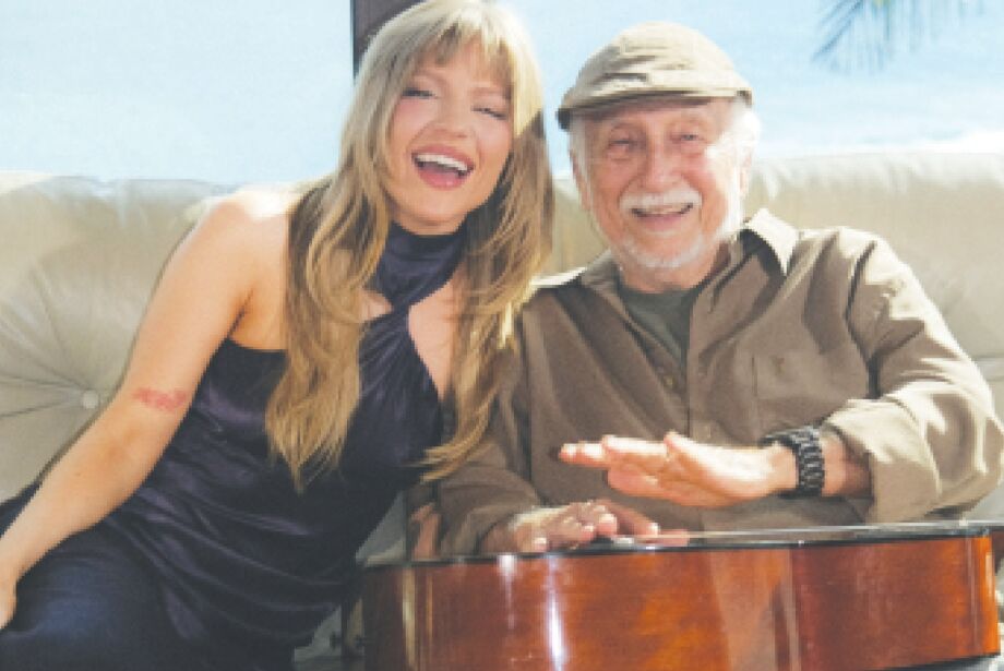 A cantora gaúcha, de 27 anos, ao lado do veterano bossa-novista Roberto Menescal, atualmente com 88 anos - Foto: Divulgação / Pam MartinsPor sugestão de Douglas Moda, aceita pela cantora “desde que a capella”, um áudio foi enviado para Menescal, que botou seu violão, deu um trato na harmonia e no formato.