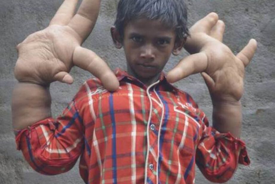 Um menino indiano de oito anos de idade, está deixando médicos perplexos com suas mãos gigantescas, que pesam 13 quilos e medem da base da palma até a extremidade do dedo médio, cerca de 3 centímetros. Kaleem, um grande fã de críquete, ficou incapaz de fazer as tarefas mais básicas, incluindo amarrar os cordões dos sapatos e alimentar-se. Por causa de sua deformidade, o garoto também sofre bullying na escola. “Eu não vou para a escola porque o professor diz que outras crianças têm medo de minhas mãos. Eles diziam “vamos bater no garoto com as mãos grandes”, diz.​
