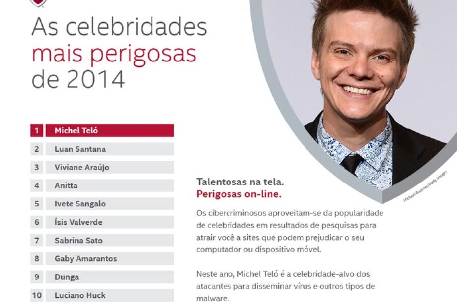 A McAfee, fabricante de antivírus, divulga anualmente quem são as celebridades brasileiras "mais perigosas da Internet". Em 2014, a equipe fez o levantamento dos nomes de famosos, entre atores, músicos, comediantes, atletas e personalidades em geral, que mais são utilizados por hackers como iscas para vírus. O sertanejo Michel Teló, famoso internacionalmente, lidera o ranking no país.