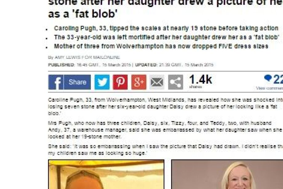 “Foi tão embaraçoso quando vi a imagem que Daisy tinha desenhado. Eu não sabia que minha filha me via tão grande”, disse Pugh. Embora ela já tenha quebrado uma cadeira ao se sentar, na época em que estava grávida, o desenho da filha foi a motivação que a mãe precisava para emagrecer.