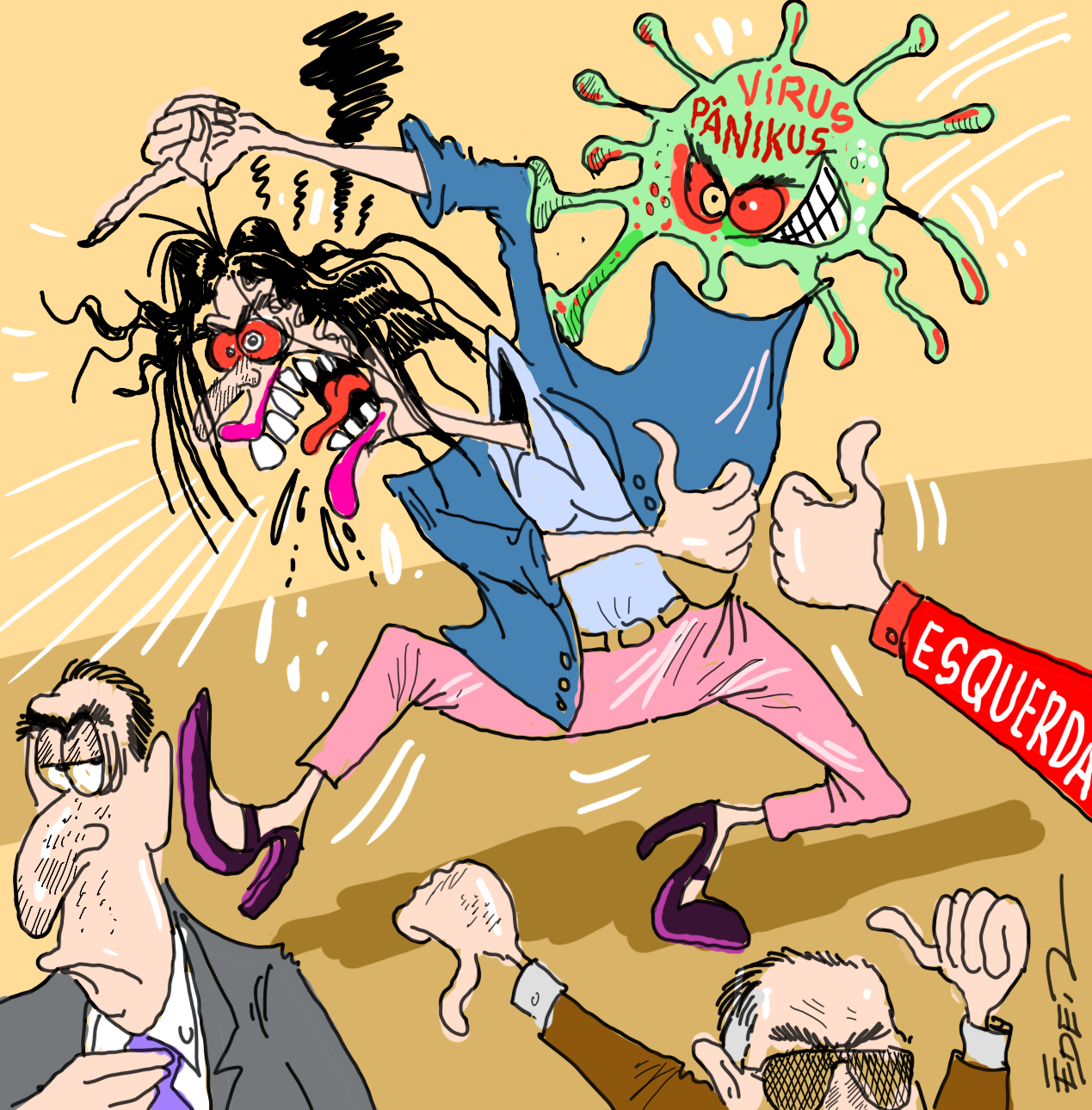 Nos bastidores, postura política de figurinha virou motivo de piadas, pois demonstra estar mais perdida que cupim em metalúrgica. Se diz de direita, flerta com a esquerda, briga com ex-companheiros, se faz de vítima, fala em perseguição mas é quem persegue e por aí vai. Tem comando “postiço”, estilo “finjo que mando, vocês fingem que acreditam”. Andou falando pelos cotovelos, como diria vovó, e teve que rapidamente se utilizar do “esporte” preferido da maioria dos políticos: culpar a imprensa. Enfim, estão dizendo que teria sido afetada pelo “vírus pânicus de sem votus”.