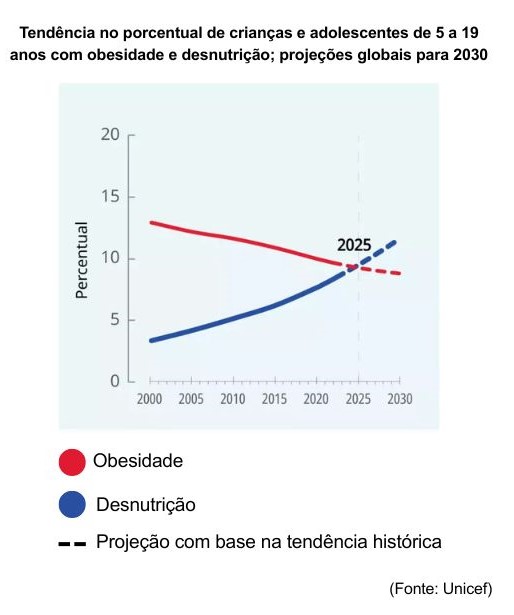 O último relatório do Fundo das Nações Unidas para a Infância (Unicef), divulgado em setembro de 2025, mostra que o número de jovens de 5 a 19 anos está acima do peso. No mundo todo, 9,4% das crianças estão com quilos a mais, enquanto que 9,2% estão abaixo do peso.