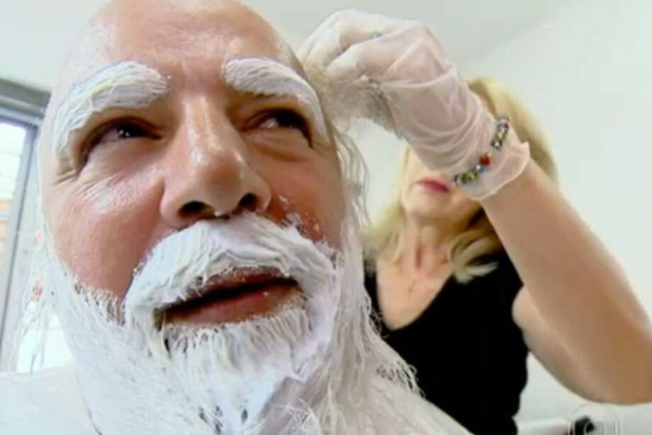 Na transformação, ele precisou ir ao salão de beleza e descoloriu a barba, cabelo e até sobrancelha para tirar o amarelado do grisalho e deixá-los brancos.