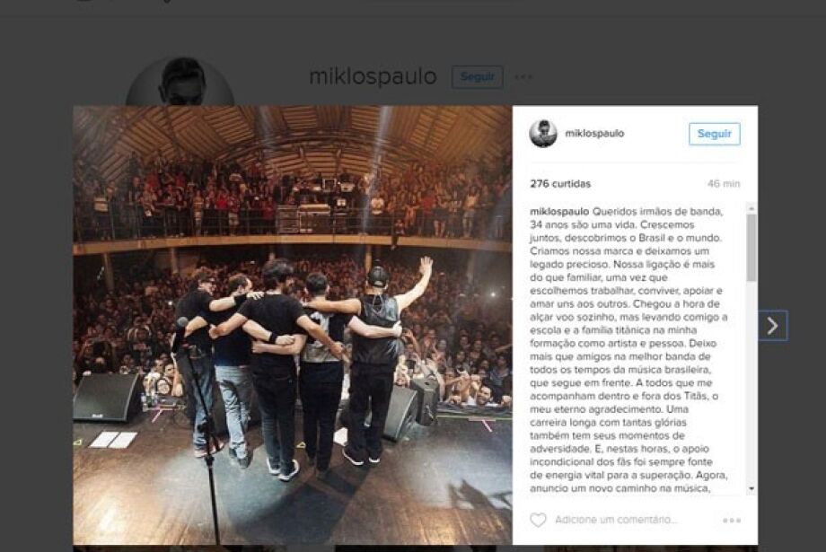 Em seus perfis nas redes sociais, o próprio Paulo Miklos comentou sua saída. "Chegou a hora de alçar voo sozinho, mas levando comigo a escola e a família titânica na minha formação como artista e pessoa. Deixo mais que amigos na melhor banda de todos os tempos da música brasileira, que segue em frente", escreveu ele no post (leia a íntagra abaixo), lembrando as mais de três décadas que esteve no Titãs ("34 anos são uma vida").