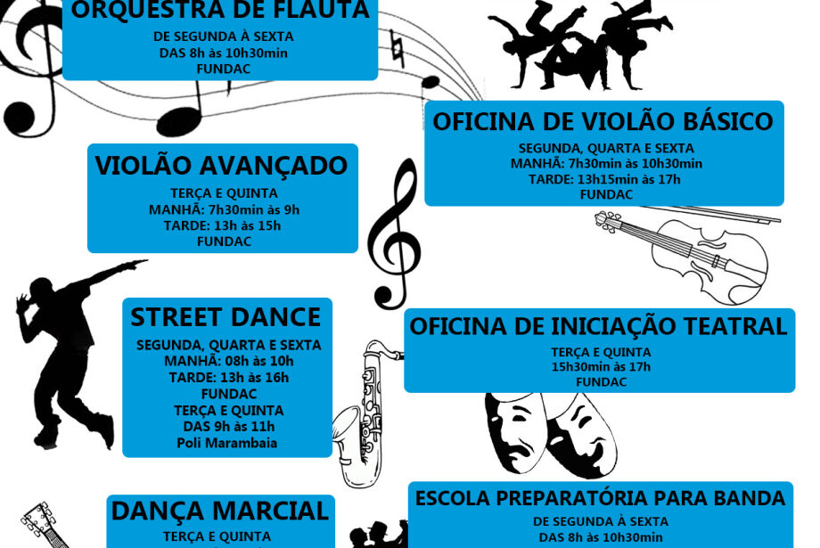 A Fundação da Cultura de Ponta Porã (Fundac) abre inscrições de diversos projetos e oficinas como: Escola Preparatória para Banda Municipal Isaac Borges Capilé, Orquestra de Flauta Doce, Oficina de Violão Básico e Avançado, Dança Marcial, Street Dance, Projeto Dança Porã (Balet) e Oficina de Iniciação Teatral, as inscrições se encerram no dia 05/02.