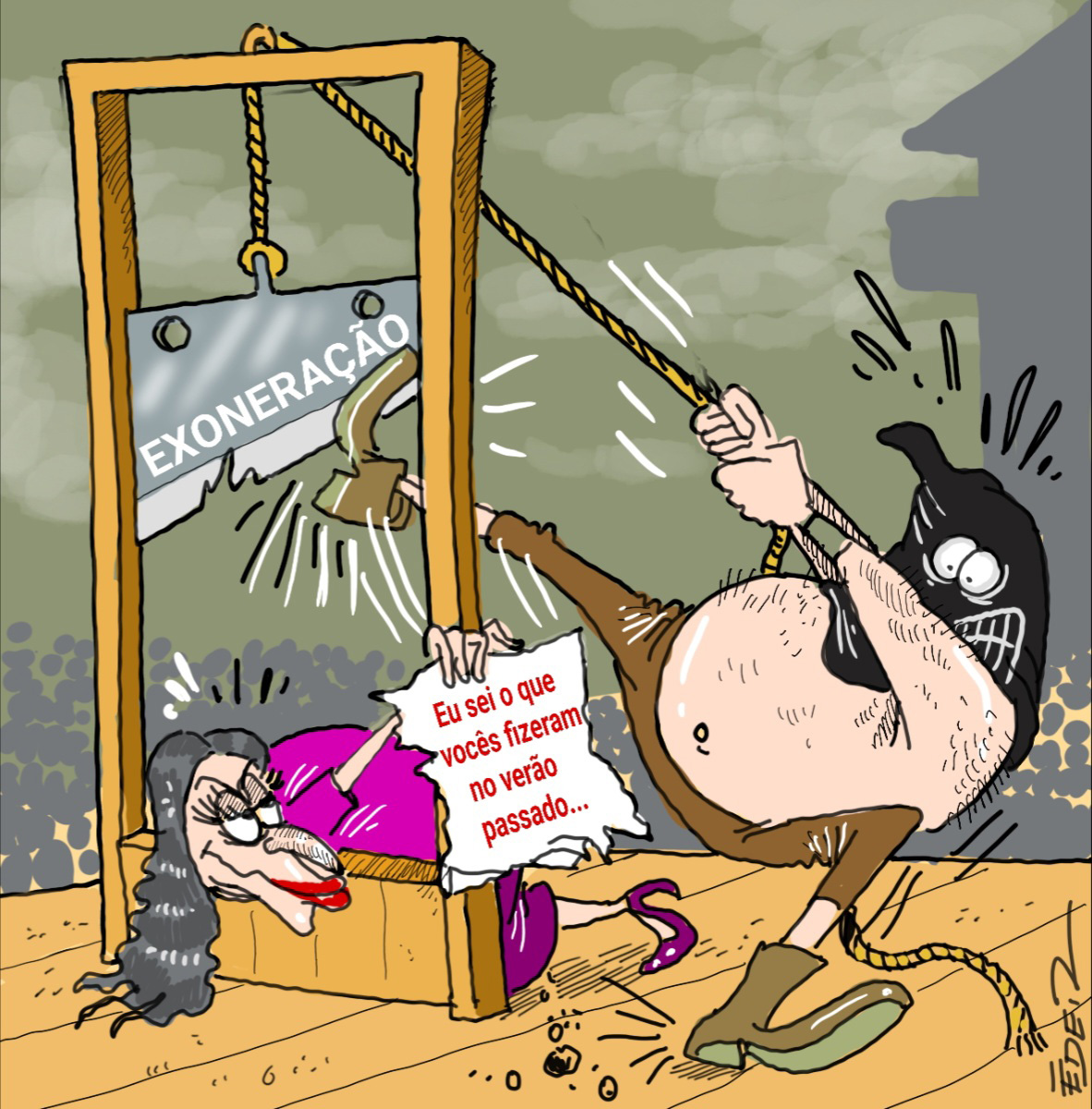 Quando tomou conhecimento de que sua demissão estava pronta para ser assinada, figurinha agiu rápido como um relâmpago e “clareou” a sala onde estava sendo selado seu destino. Ela teria dado o alerta no estilo “eu sei o que vocês fizeram no verão passado”. Diante disso, a caneta continuou trancada na gaveta e a exoneração foi descartada, seguida da tradicional desculpa de que “você entendeu errado”. Assim, a figurinha em questão tirou o pescoço da guilhotina e continua lépida e fagueira atuando, mas tendo segredo guardado no cofre. E assim caminha a humanidade...