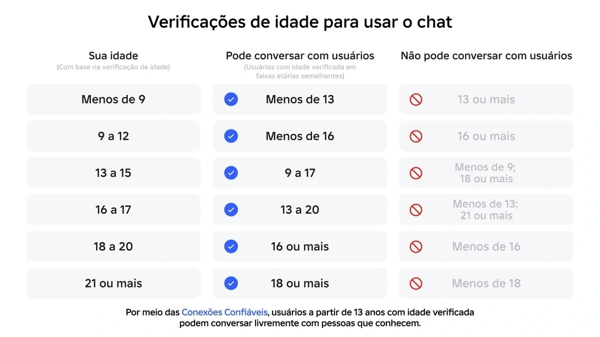 - Usuários com 13 anos ou mais que fizeram a verificação de idade podem se conectar e conversar mais livremente com pessoas que eles conhecem além da sua faixa etária próxima usando a funcionalidade Conexões Confiáveis.