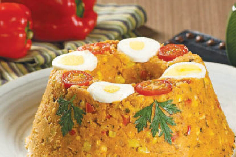 - Distribua o restante da massa do cuscuz, com bastante cuidado, na forma, de maneira que não desmanche a decoração. Quando terminar, aperte suavemente com as costas de uma colher. Deixe descansando por 5 minutos. Desenforme e sirva em fatias.