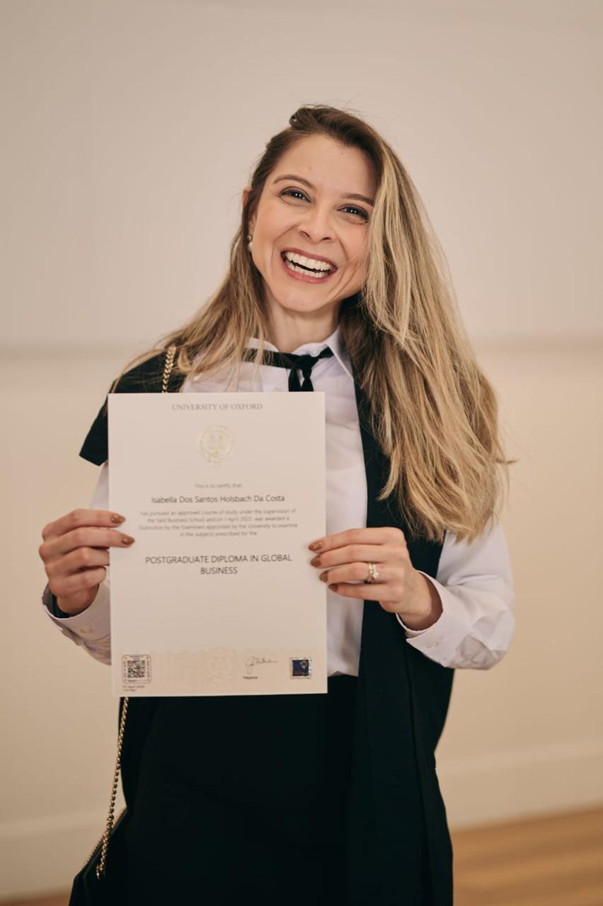 A campo-grandense Izabella dos Santos Holsbach está cursando mestrado em Londres, na universidade de Oxford, e foi agraciada com distinção. Ela é filha de Sônia dos Santos e Henrique Holsbach.