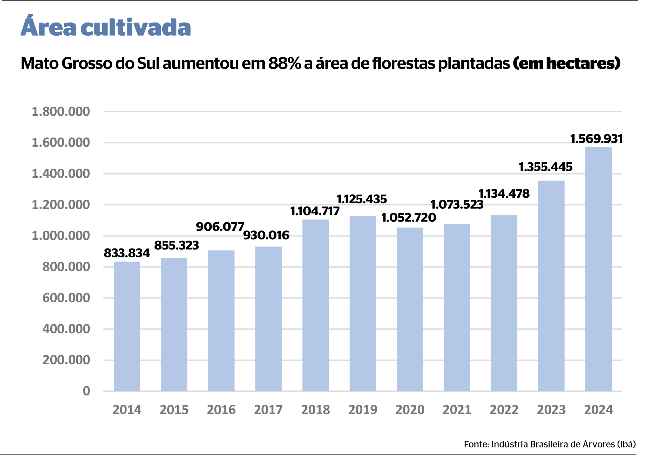 Ainda segundo um levantamento da Ibá, somente entre 2023 e 2024 a área de florestas plantadas cresceu 15,8% em MS, passando de 1.355.445 hectares para 1.569.931 hectares. Desse total, 99,5% correspondem a eucalipto destinado à indústria de celulose, enquanto o pinus representa apenas 0,5%.