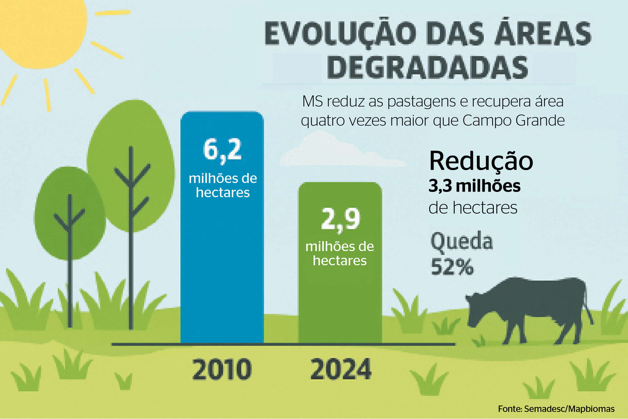 Mato Grosso do Sul atravessa uma das mais profundas transformações estruturais do uso da terra no País. Entre 2010 e 2024, o Estado reduziu em 52% a área de pastagens degradadas, que caiu de 6,2 milhões para 2,9 milhões de hectares.