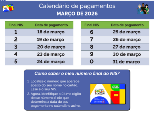 O benefício garante um valor médio mensal de R$ 698,21 às famílias cadastradas. Os pagamentos referentes ao mês de março começam nesta quarta-feira (18) e vão até o dia 31, seguindo o final do Número de Identificação Social (NIS).