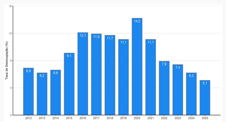 O número de desempregados no Brasil atingiu o número mais baixo desde a série histórica do Instituto Brasileiro de Geografia e Estatística (IBGE), que teve início em 2012. No último trimestre de 2025, encerrado em dezembro, a taxa de desocupação do País caiu a 5,1%.