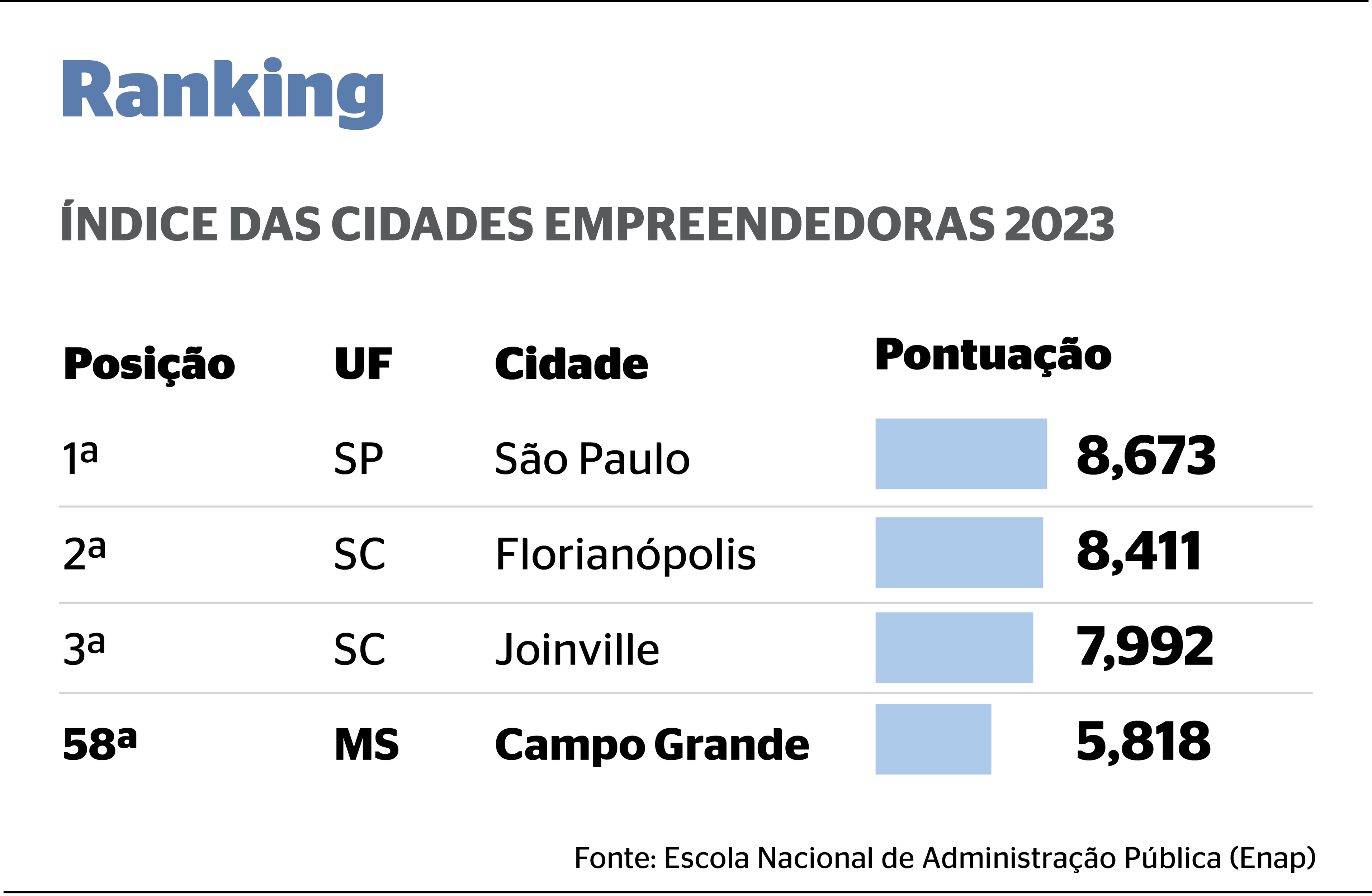 No índice geral, a melhor cidade para se empreender, conforme o relatório, é São Paulo (SP), seguida de Florianópolis (SC) e Joinville (SC). O presidente da Câmara de Dirigentes Logistas (CDL), Adelaido Vila, ainda avalia que Campo Grande está em desenvolvimento.
