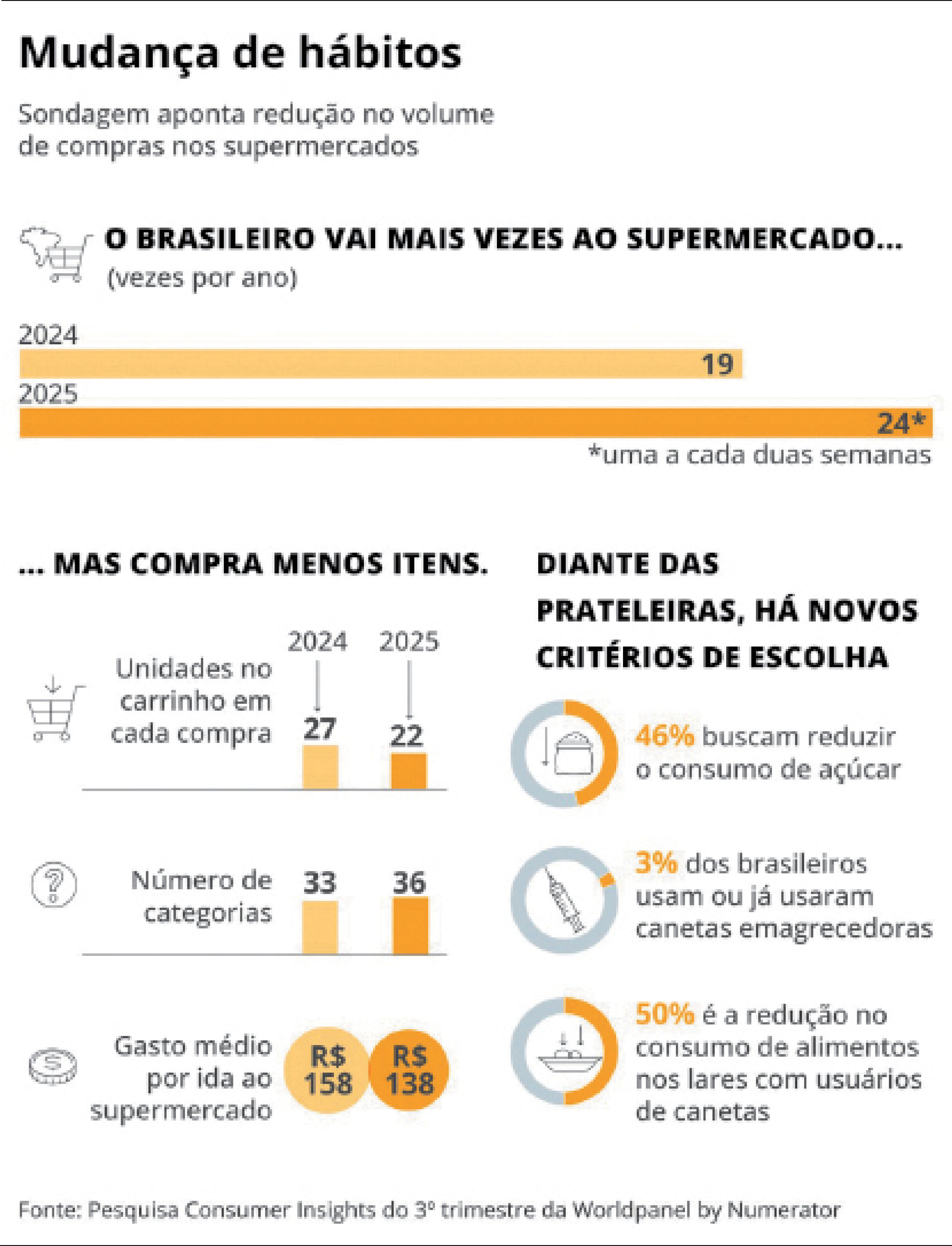 Pesquisa da Worldpanel by Numerator publicada pelo jornal O Globo, aponta que além do crédito caro, o endividamento e a pressão da inflação sobre o orçamento familiar, os gastos com as bets e canetas emagrecedoras, tem pesado no bolso do consumidor.