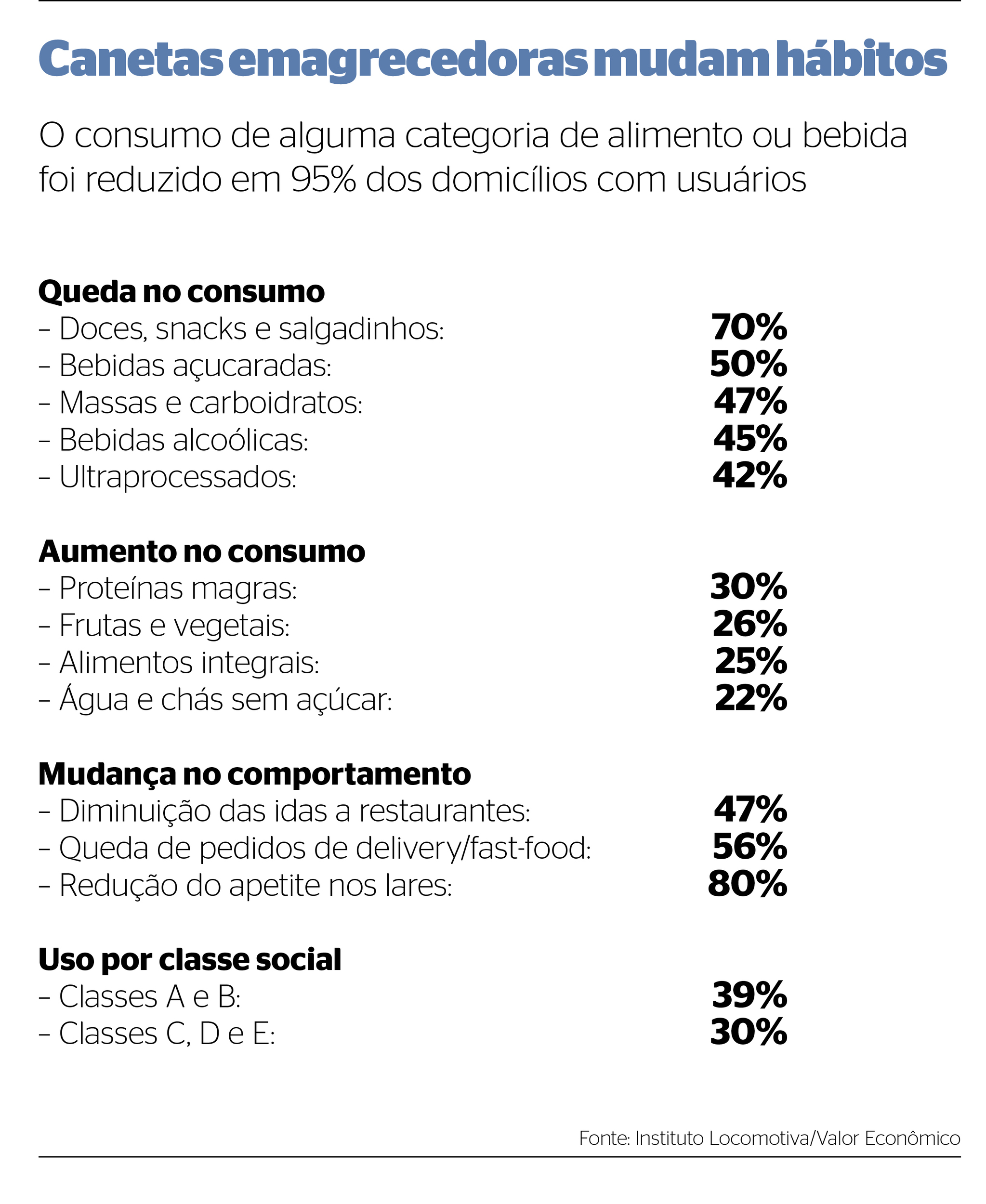 Levantamento do Instituto Locomotiva, publicado pelo Valor Econômico, mostra que 95% dos domicílios em que há usuários dessas medicações registraram redução no consumo de pelo menos uma categoria de alimentos ou bebidas.