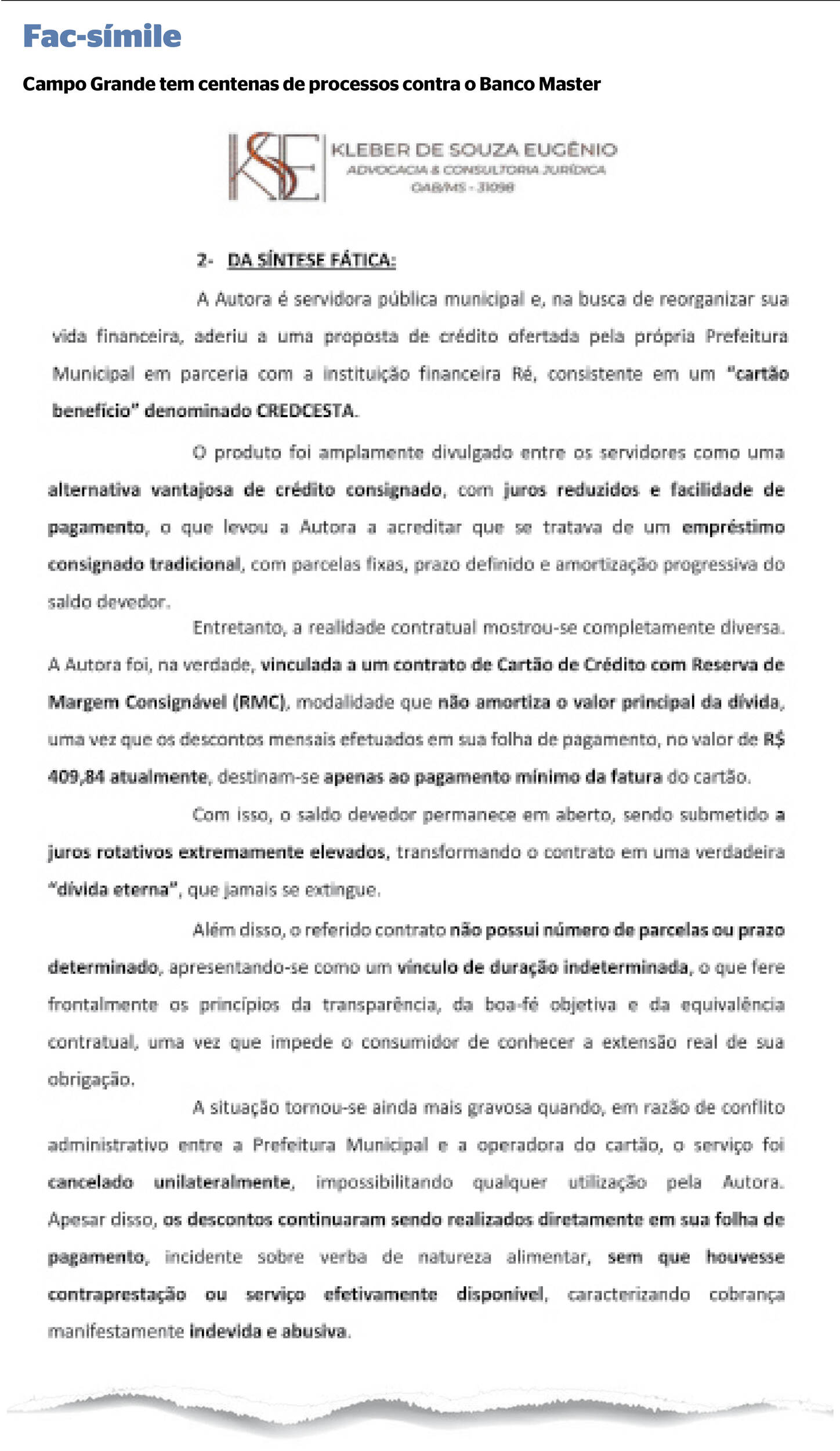 O Correio do Estado chegou a denunciar a armadilha à qual os servidores do município estavam sendo submetidos em julho do ano passado. A reportagem foi anexada neste processo da servidora, o mais recente do Judiciário de Mato Grosso do Sul de devedores do Banco Master.