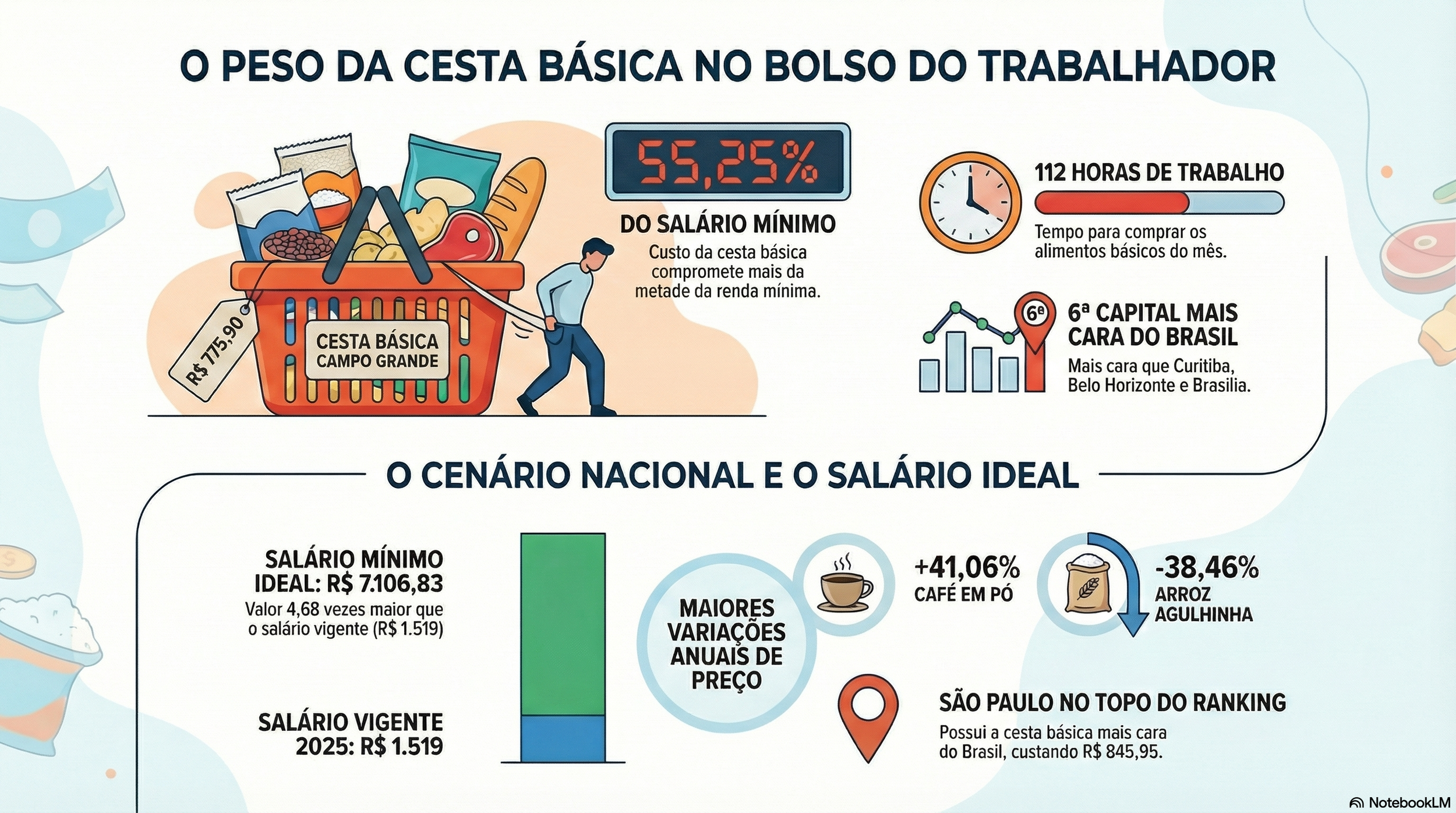 O valor da cesta básica em Campo Grande correspondeu a 55,25% do valor do salário mínimo dos trabalhadores da Capital no mês de dezembro de 2025. O valor ficou em R$ 775,90, enquanto o salário mínimo encerrou o ano em R$ 1.519.