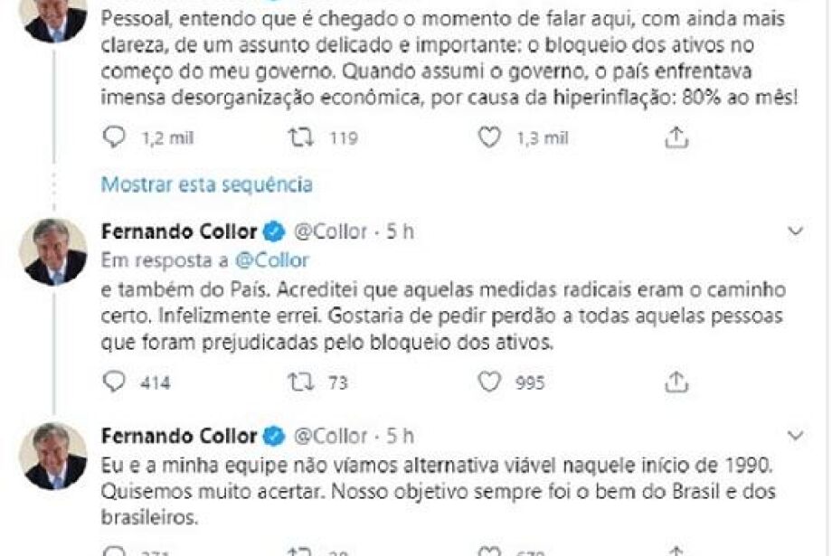 O pedido de desculpas acontece mais de 30 anos após o anúncio do Plano Collor 1, em 16 de março de 1990. "Acreditei que aquelas medidas radicais eram o caminho certo. Infelizmente errei. Gostaria de pedir perdão a todas aquelas pessoas que foram prejudicadas pelo bloqueio dos ativos", escreveu.