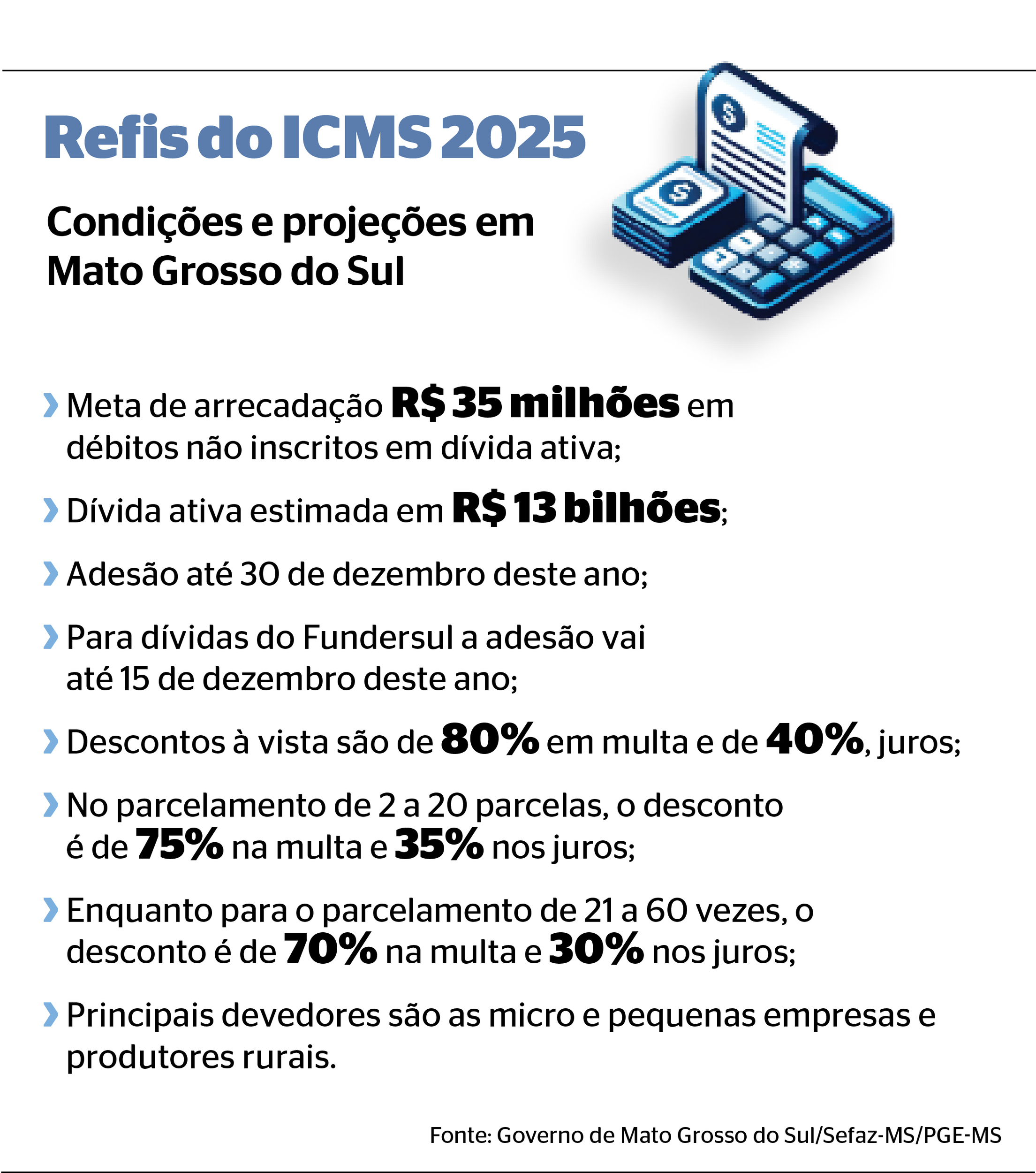 O governo de Mato Grosso do Sul lançou o Programa de Recuperação de Créditos Fiscais (Refis 2025) com a expectativa de arrecadar R$ 35 milhões, conforme informou a Secretaria de Estado de Fazenda (Sefaz) ao Correio do Estado.