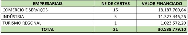• 21 cartas da linha FCO Empresarial, no valor de R$ 30.538.779,10;