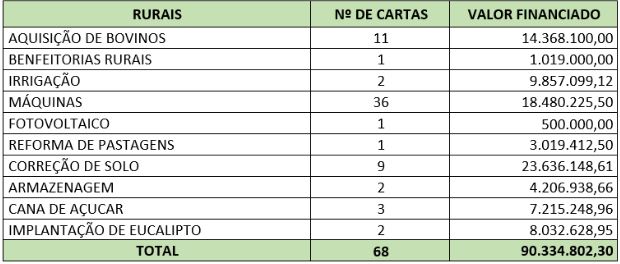 • 68 cartas da linha FCO Rural, no valor de R$ 90.334.802,30.