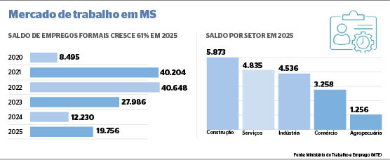 Mato Grosso do Sul fechou 2025 com um saldo positivo de 19.756 empregos com carteira assinada, resultado de 419.472 admissões e 399.716 demissões. O número é 61% maior que o saldo do ano anterior, que foi de 12.230, mas ainda está aquém dos anos imediatamente anteriores.