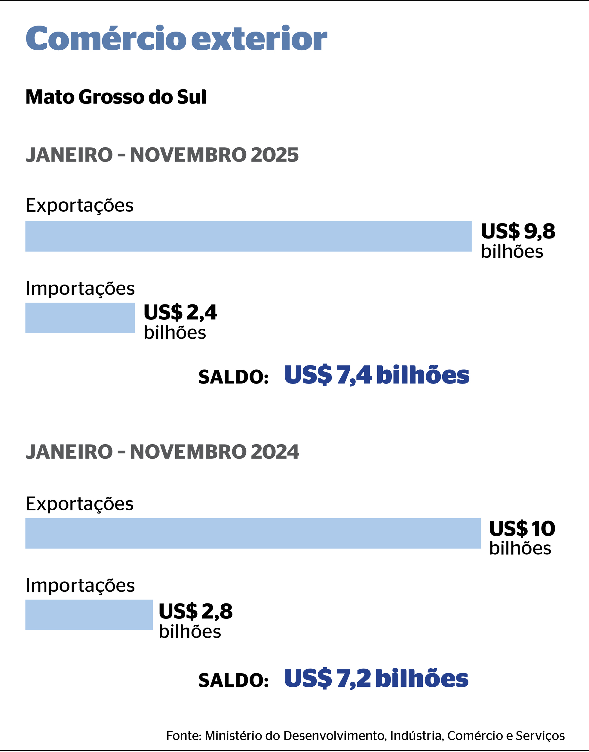 No acumulado do ano, de janeiro a novembro, a venda de produtos originários de Mato Grosso do Sul para outros países alcançou US$ 9,8 bilhões. Faltam US$ 200 milhões para igualar o volume do ano passado e US$ 700 milhões para igualar 2023, ano em que as exportações do Estado foram recordes: US$ 10,5 bilhões.
