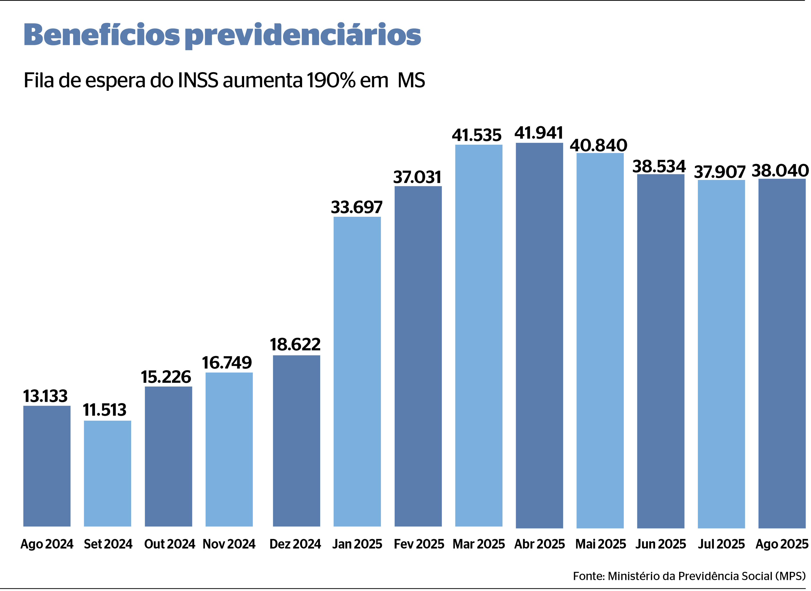 Em um ano, a fila de espera por benefícios do Instituto Nacional do Seguro Social (INSS) quase triplicou em Mato Grosso do Sul. De acordo com dados do Ministério da Previdência Social (MPS), o número de requerimentos saltou de 13.133 em agosto de 2024 para 38.040 em agosto deste ano, revelando a piora de um problema que, há muito tempo, preocupa segurados.
