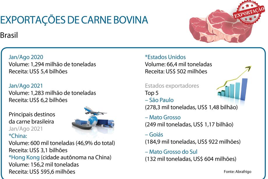 As vendas da carne bovina para a China equivalem à metade da receita das exportações do produto deste ano e a 46,8% do volume. A diferença entre receita e volume ocorre porque os chineses pagam um preço acima do valor de mercado pela carne brasileira.