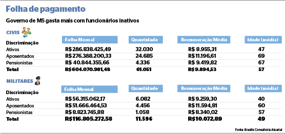 Conforme o documento, elaborado pela Brasilis Consultoria Atuarial, são 32.030 servidores ativos em Mato Grosso do Sul, outros 24.685 aposentados e 4.336 pensionistas civis. Constam ainda os militares, que são 6.082 ativos, 4.456 inativos e 1.058 pensionistas.