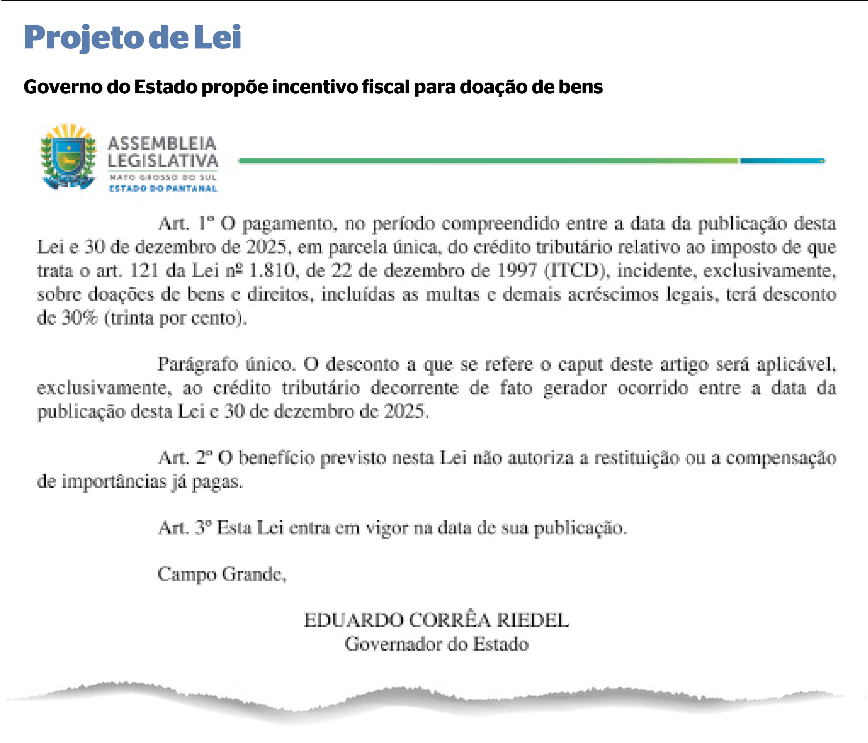O governador Eduardo Riedel (PP) encaminhou à Assembleia Legislativa de Mato Grosso do Sul (Alems) o Projeto de Lei nº 237/2025, que cria um benefício fiscal temporário para contribuintes que realizarem doações de bens e direitos. A proposta prevê desconto de 30% no pagamento do Imposto sobre Transmissão Causa Mortis e Doação (ITCD) para quitação em parcela única, desde a entrada em vigor da lei até o dia 30 de dezembro deste ano.